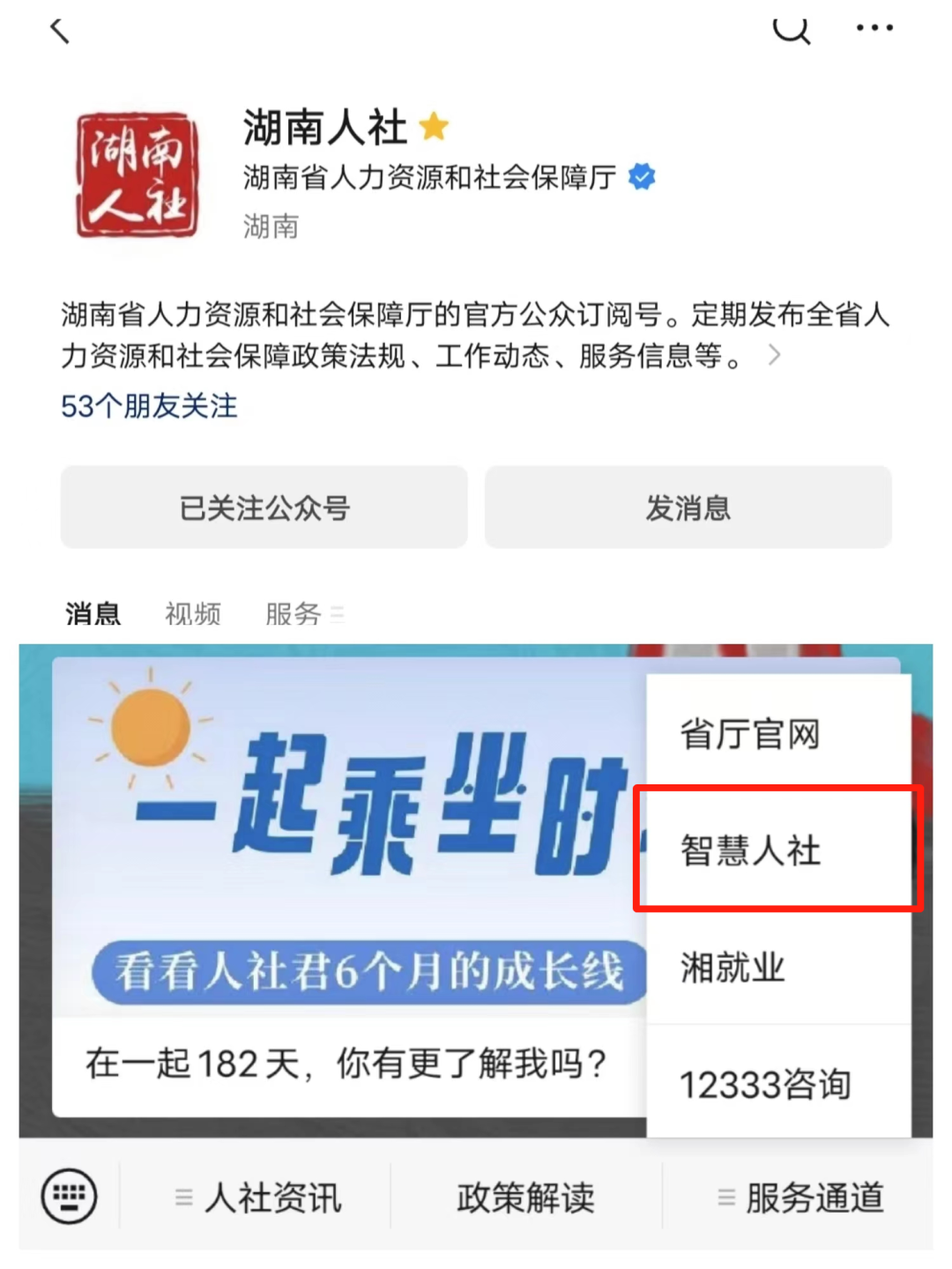 2、關(guān)注“湖南人社”“智慧人社”微信公眾號,點(diǎn)擊【服務(wù)通道】→【智慧人社】→【更多】→【社會(huì )保險-失業(yè)保險金申領(lǐng)】→【失業(yè)保險金申領(lǐng)】辦理;